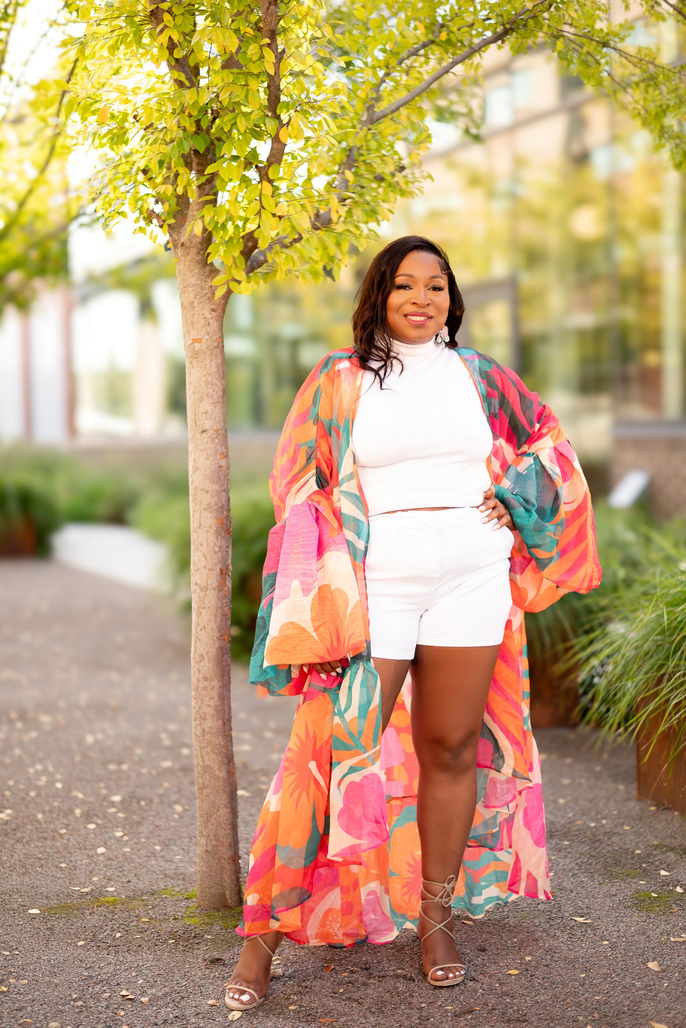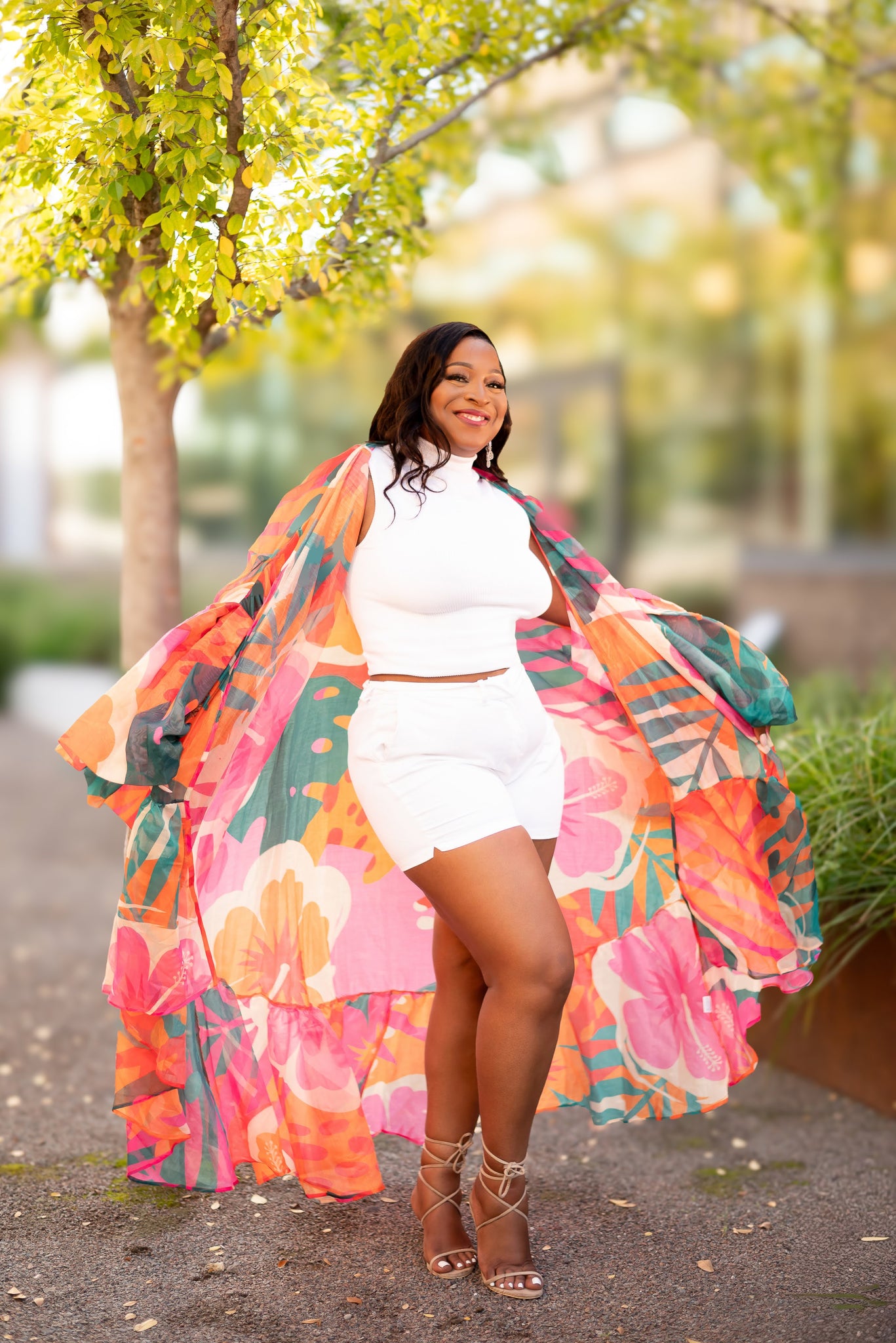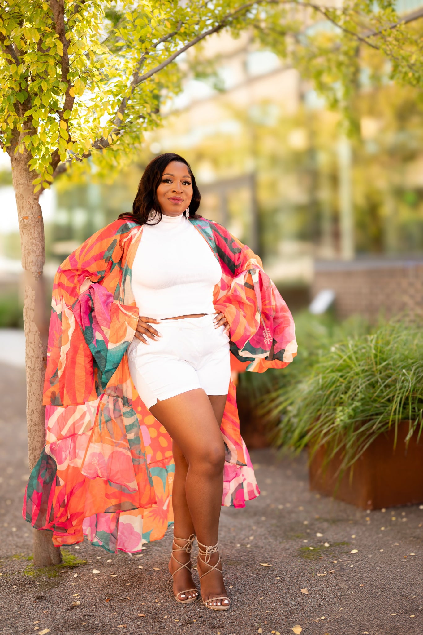 Step into effortless style with our Vibrant Elegance; the perfect blend of bold and sophisticated. This ensemble features a floor-length sheer kimono in a stunning abstract print of vibrant pinks, oranges, and greens, adding a pop of color and movement with every step. This outfit is perfect for brunch, vacation, or any occasion that calls for confidence and color.