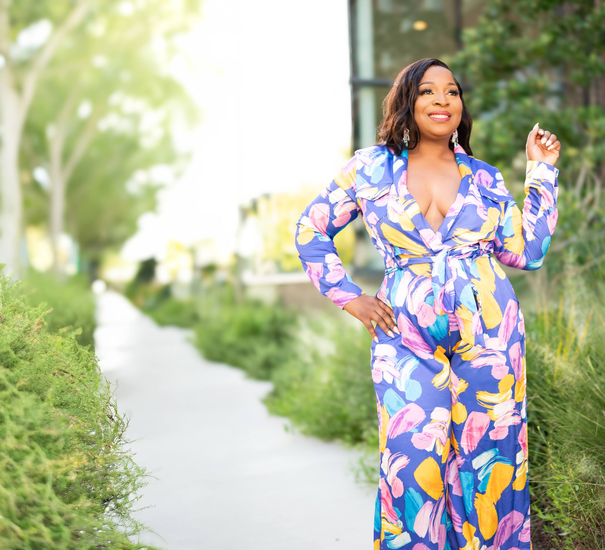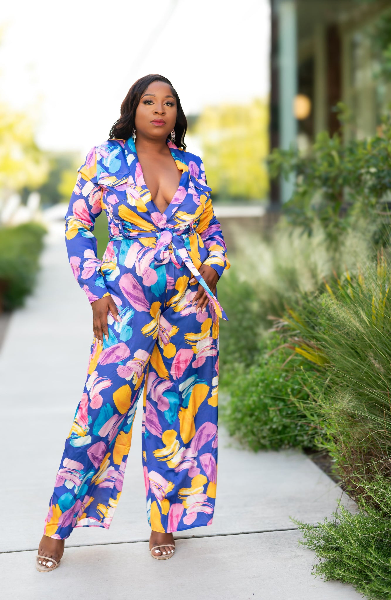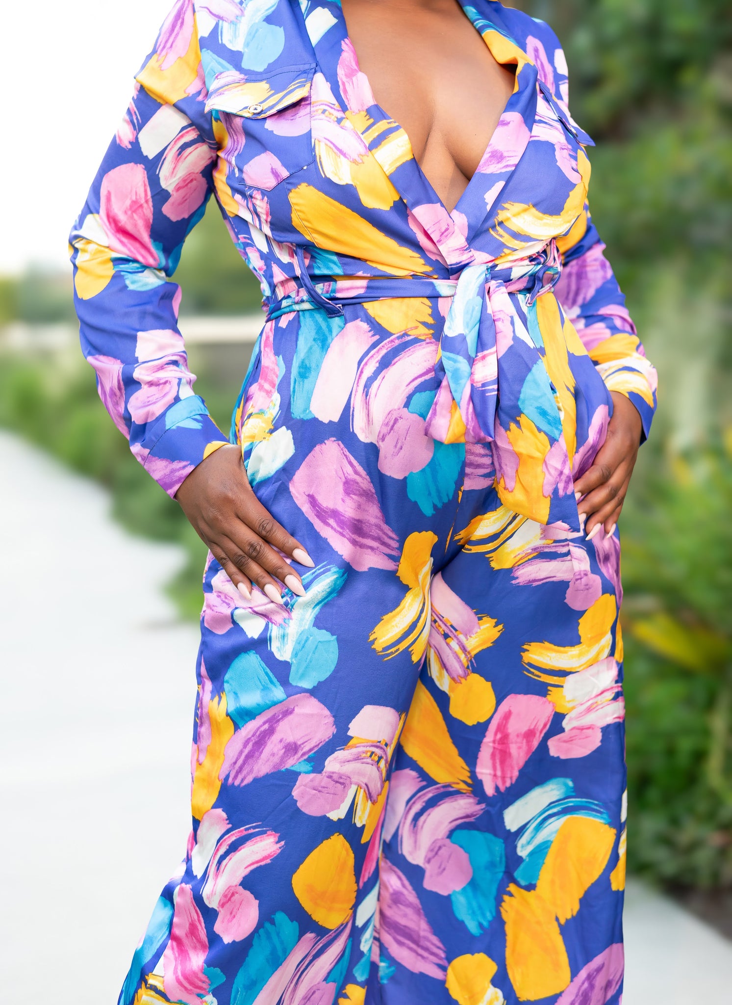 Step into the spotlight in the Public Figure Jumpsuit, where bold color meets boss energy. This stunning one-piece features a vibrant abstract floral print in purple, pink, yellow, and blue guaranteed to turn heads. The deep V-neckline, belted waist, and wide-leg silhouette create a flattering, confident look that's perfect for making moves and making statements.