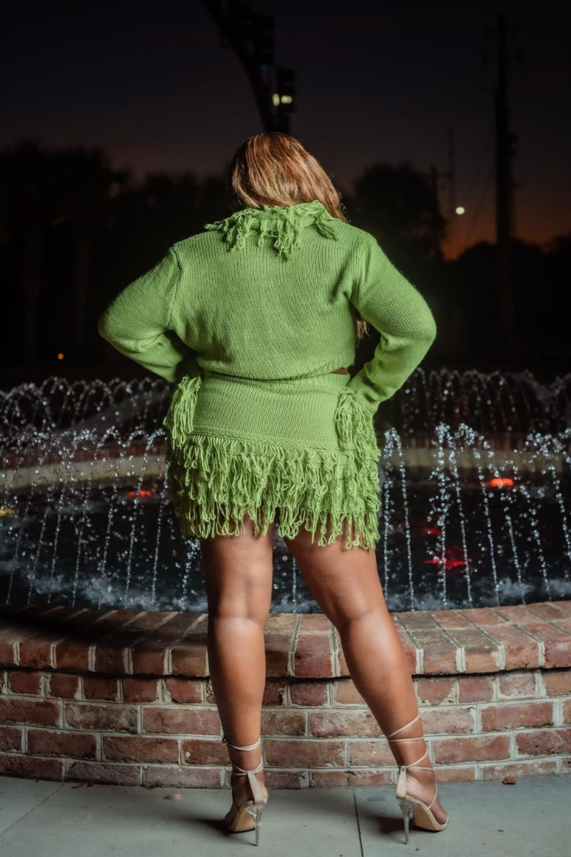 Make an unforgettable entrance in this sleek green fringe set that blends sultry sophistication with bold texture. Featuring a deep V-tie front top and matching fringe skirt, this look is perfect for a night out, dinner date, or any occasion where you want to stand out with class and confidence.