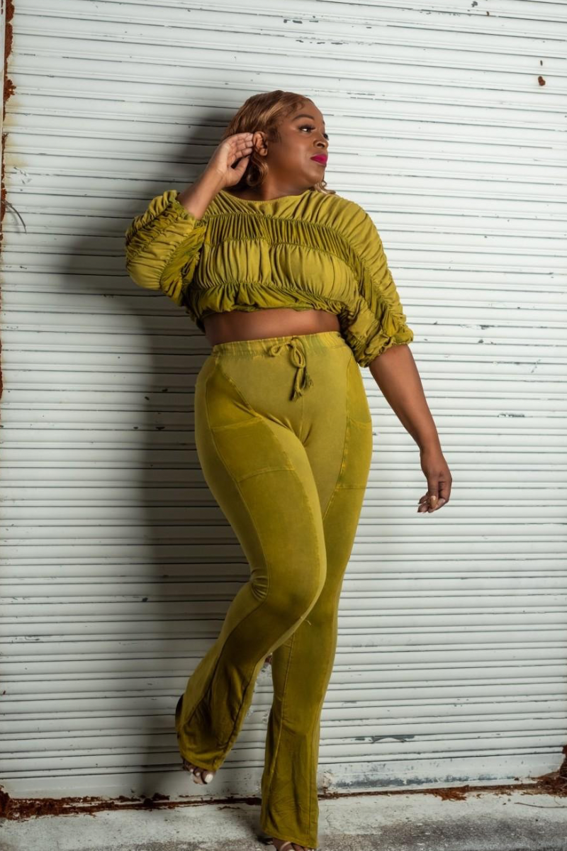 Turn heads in this stunning olive green two-piece set that blends comfort with high end style. The ruched cropped top features billowed sleeves and a flattering elastic hem, perfectly paired with high-waisted fitted pants that hug your curves and elongate your legs. Whether you’re stepping out for brunch, a night out, or a casual event, this look gives effortless confidence with a touch of luxury.