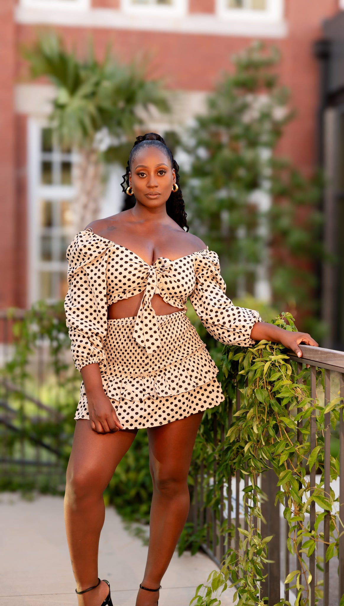 Bring the charm and turn up the flirt in the Era Set your new go to for warm weather slays. This two-piece set features a playful polka dot print, a puff-sleeve off-the-shoulder crop top with a flirty front tie, and a matching high-waisted mini skirt with a ruffled hem. The stretchy smocked waistband gives a comfy, flattering fit that hugs your waist just right.
